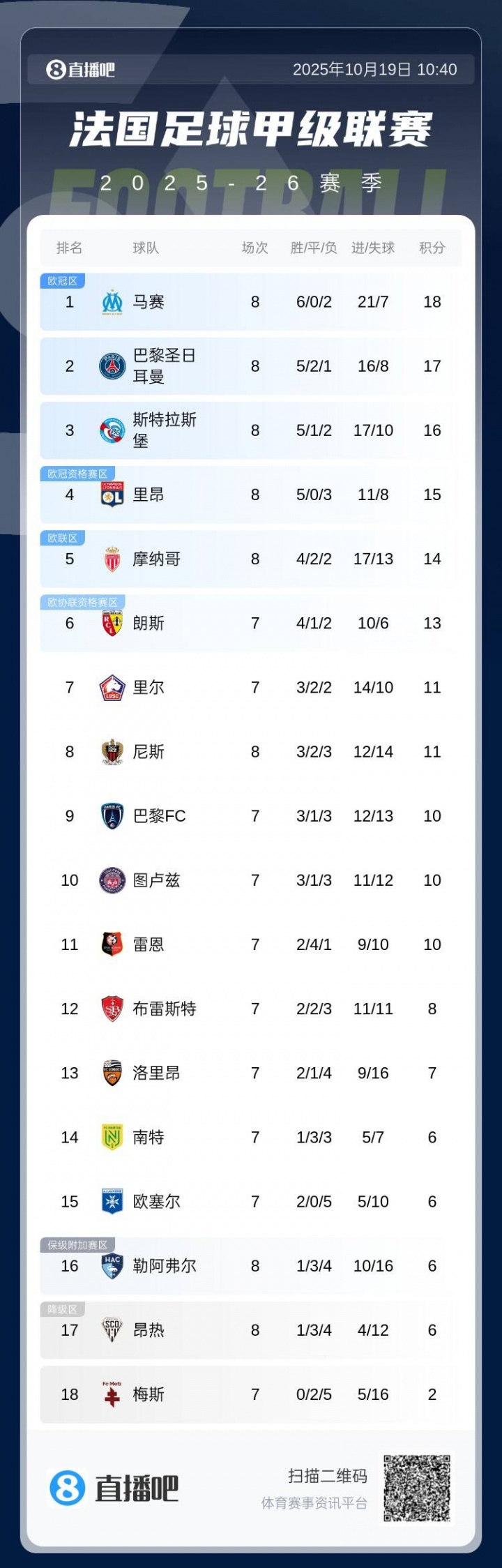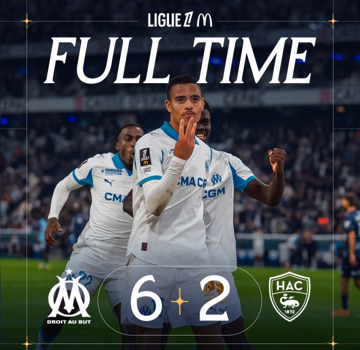 10月19日讯 法甲第8轮,马赛6-2大胜勒阿弗尔,豪取法甲5连胜,登顶积分榜。