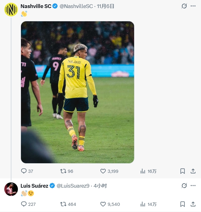 赛后苏亚雷斯评论了纳什维尔11月6日发的帖子。当时纳什维尔赢下赛事 后,球赛直播免费观看入口发了一个表情👋🏼