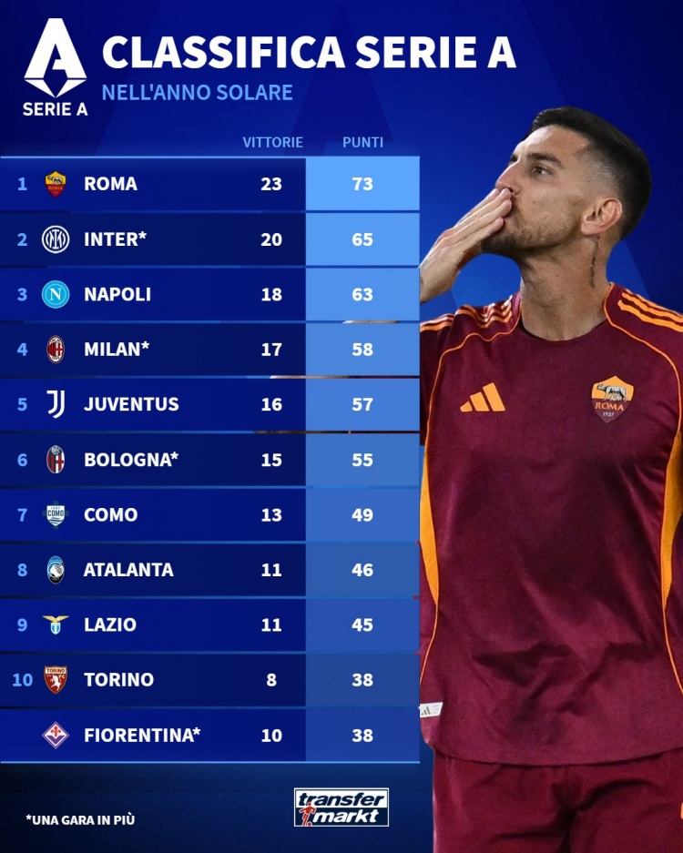 2025年意甲积分榜:罗马73分居首,国米65分、那不勒斯63分
