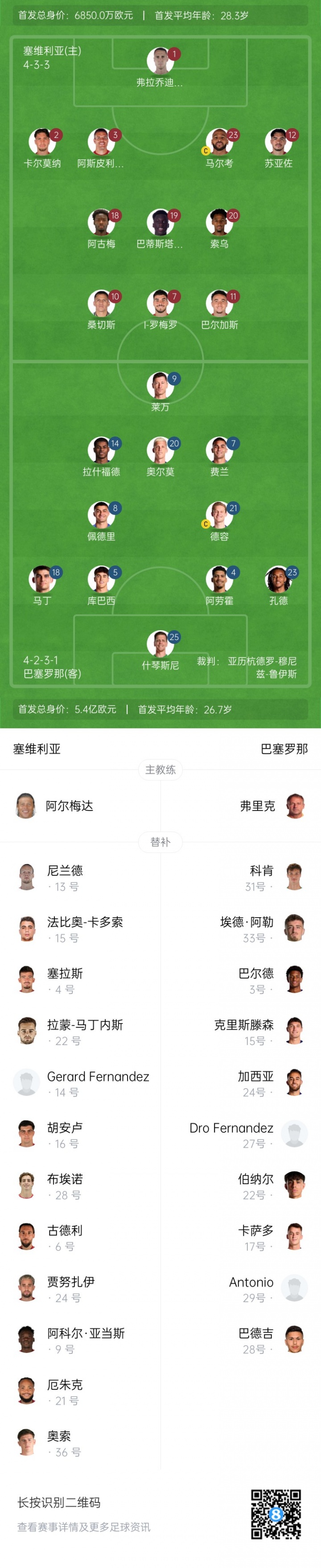 塞维利亚杆位:1-弗拉乔迪莫斯、2-卡尔莫纳、3-阿斯皮利奎塔、23-马尔考、12-苏亚佐、18-阿古梅、19-巴蒂斯塔·门迪、20-索乌、10-桑切斯、11-鲁本·巴尔加斯、7-伊萨克·罗梅罗