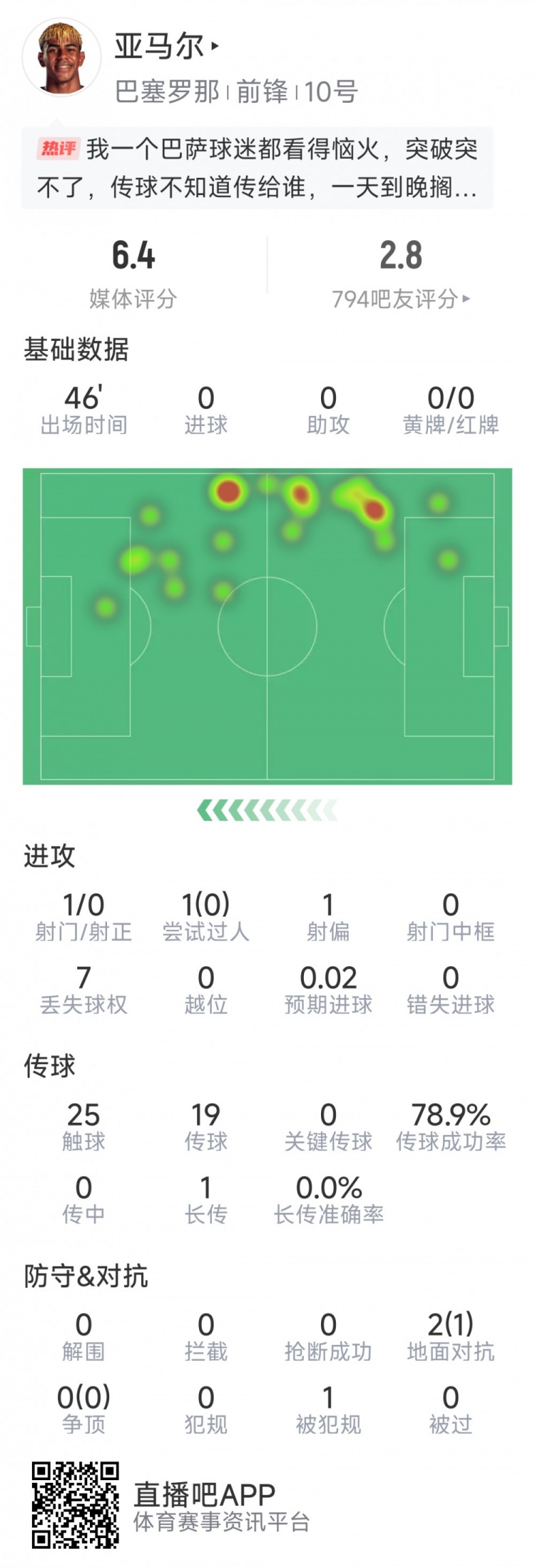 亚马尔半场数据:1次射球 0射正,过人、关键传送球 挂零,评分6.4分