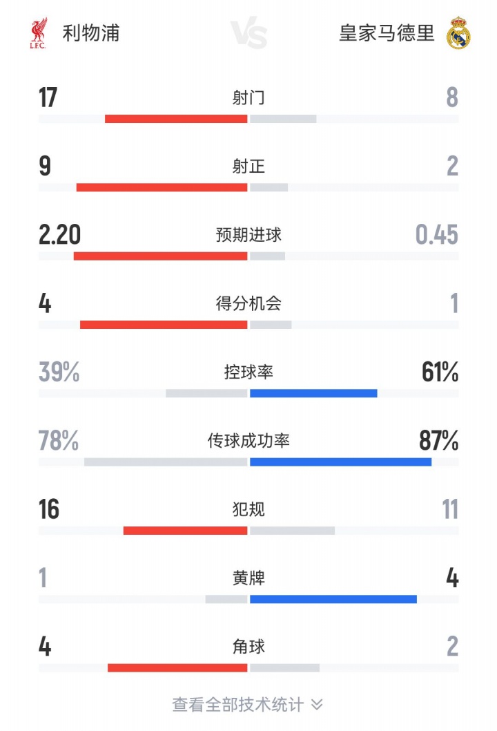 利物浦1-0皇马全场数据:红军4成盘带17射9正,皇马6成盘带8射2正