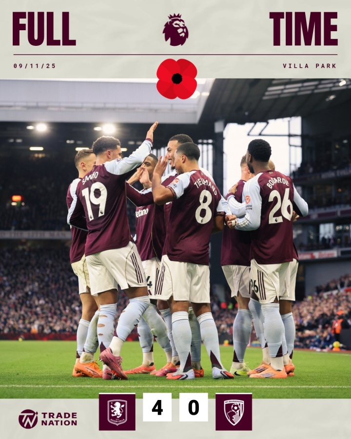 11月10日讯 英超第11轮,阿斯顿维拉4-0大胜伯恩茅斯。