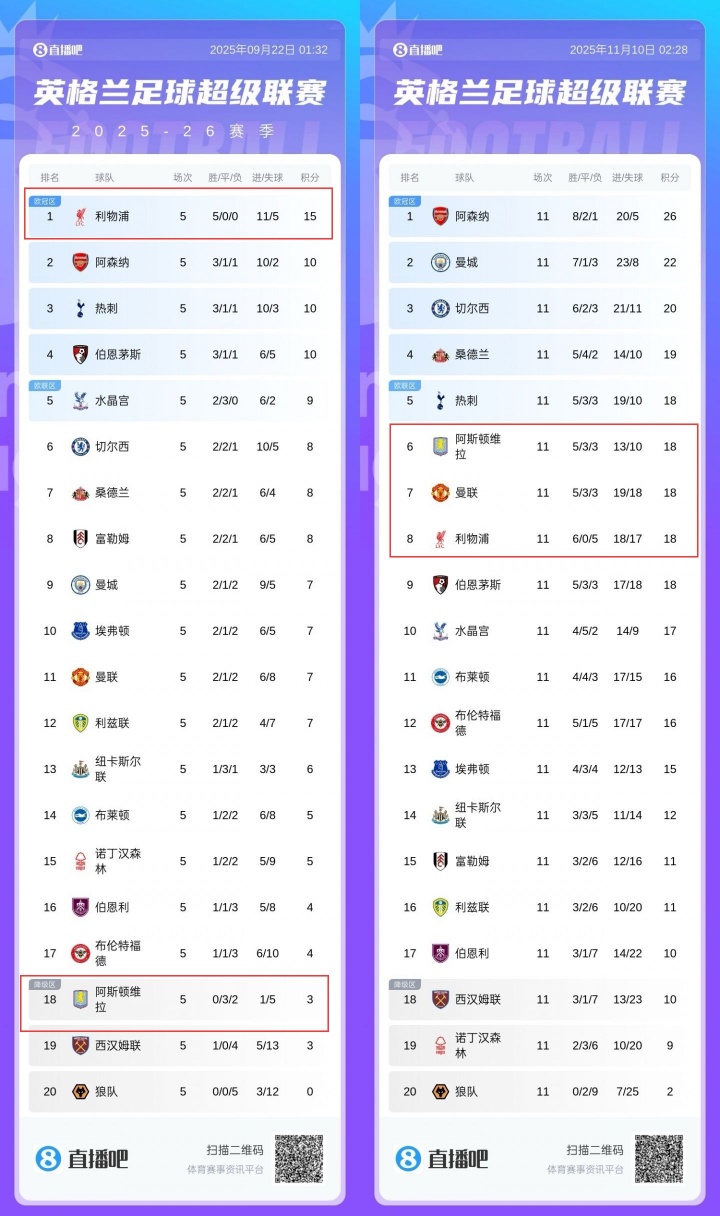 双向奔赴!第5轮时利物浦第1维拉第18,现维拉反超红军两队同分