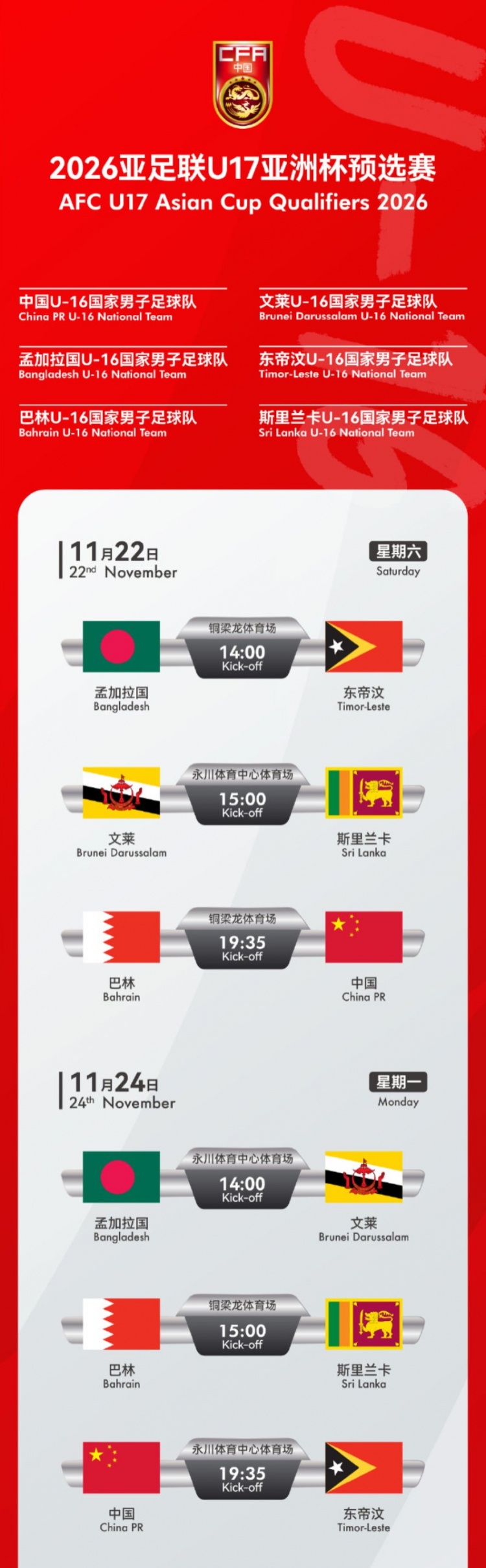 U17国少亚预赛赛程:9天5战、小组头名出线,11月22日首战巴林