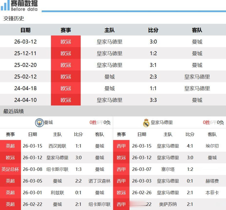 双方近6次交手,曼城1胜2平3负,处于下风。
