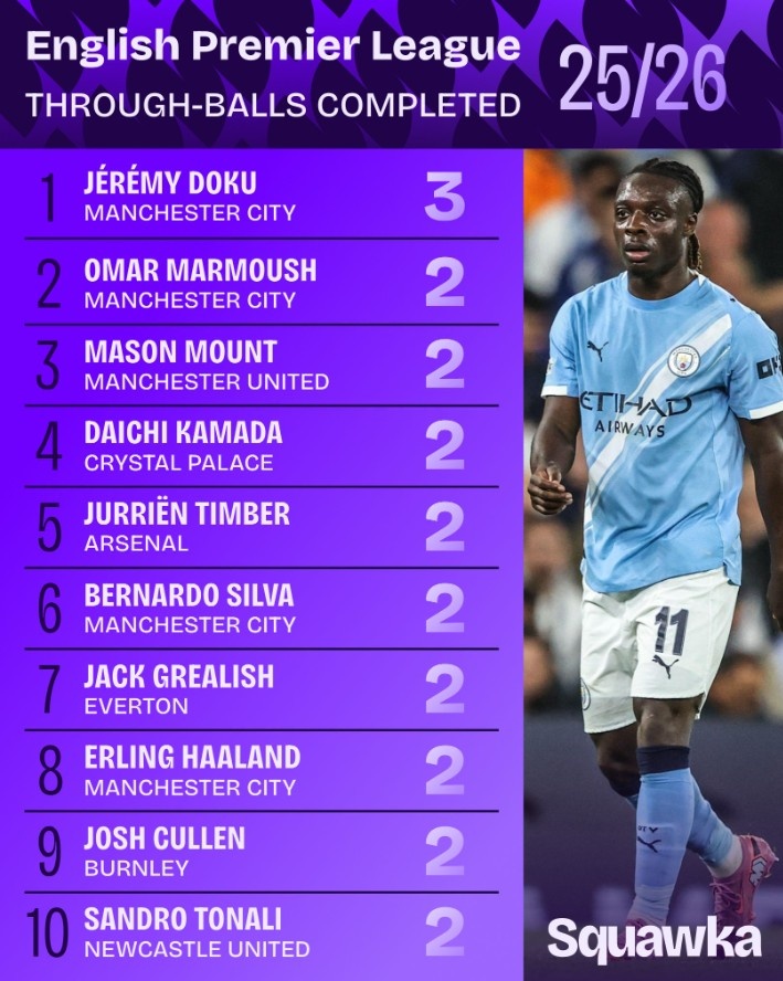 9月24日讯 本赛季英超战罢5轮,“Squawka”统计了所有球员成功完成直塞次数的排名,足球直播在线高清曼城翼锋多库以3次领跑。
