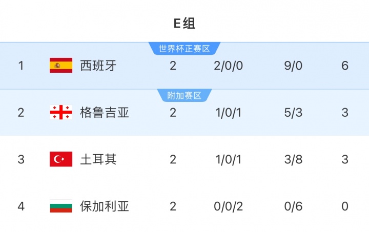 西班牙国家队将于10月中旬在世预赛中对阵格鲁吉亚和保加利亚,目前西班牙积6分位列E组第一,领跑 格鲁吉亚3分。