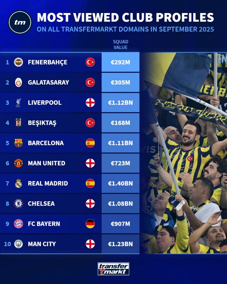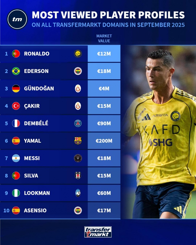 德转球员页面9月浏览量排名:C罗居首,埃德森第二、梅西第七