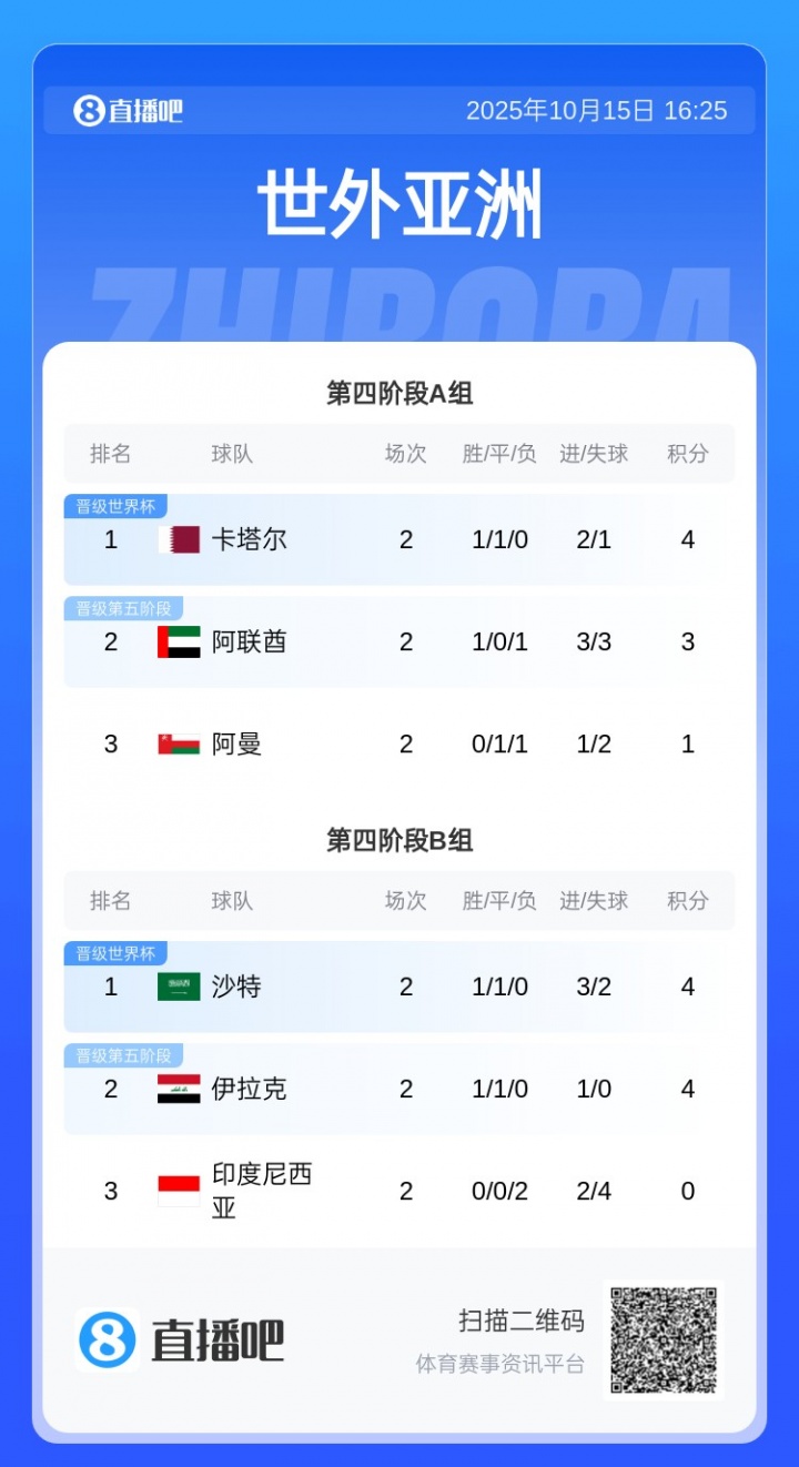 10月15日讯 世预赛亚洲区第四阶段结束,该阶段的两个主办国家卡塔尔和沙特均顺利晋级下一轮 ,两队主场作战 作战加之能比其他球队多休息3天的安排,遭到了其余国家的集体炮轰。