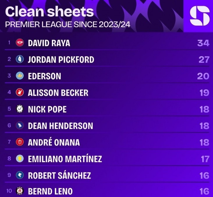 自2023/24赛季以来英超职业联赛 零封场次排行榜