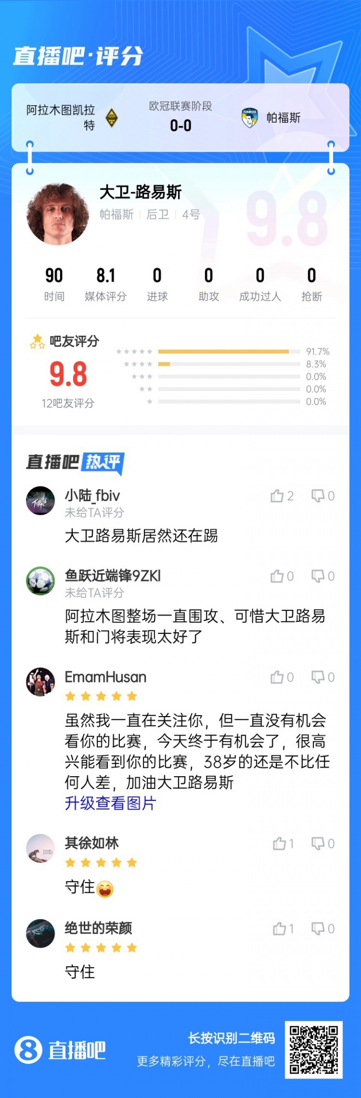 10月19日讯 欧冠职业联赛 阶段第3轮,阿拉木图凯拉特主场作战 0-0战平十人帕福斯,38岁巴西中卫大卫-路易斯为帕福斯打满全场,当选全场最佳球员。