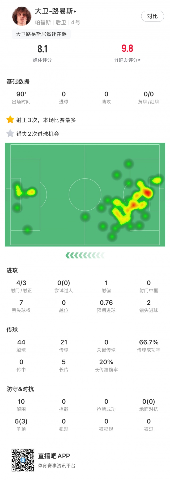 大卫-路易斯4次射球 3次射正错失2次得分 机会、10次解围、5次封堵射球 、5次争顶3次成功,获得8.1分,队内最高、全场第三高。