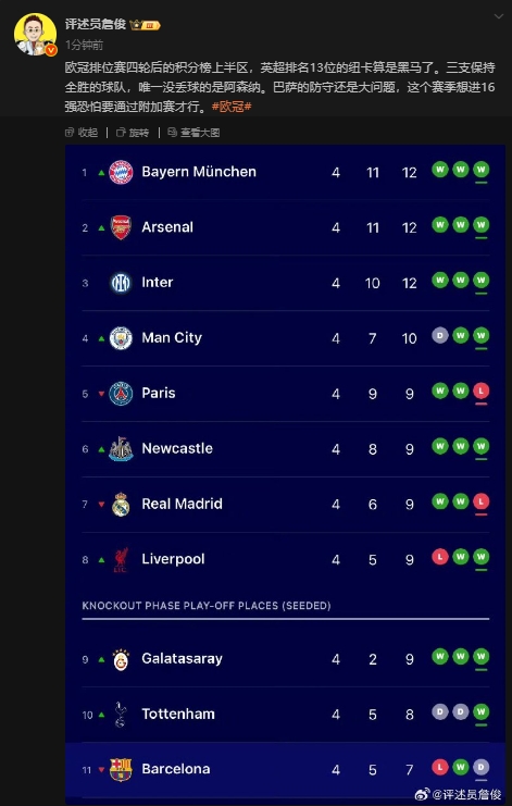 11月06日讯 欧冠第4轮赛事 已经全部结束,知名评述员詹俊在微博做出点评。