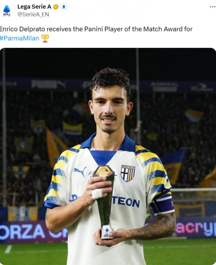 打入扳平得分 ,意甲官方:帕尔马后场球员普拉托当选战平米兰全场最佳
