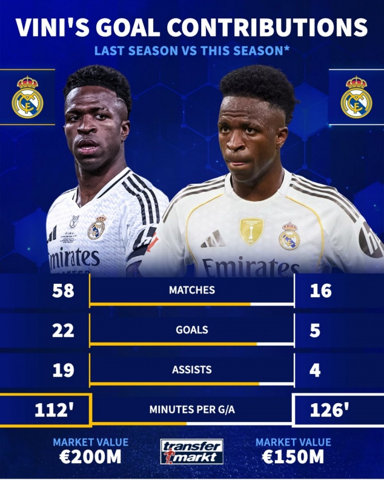 11月11日讯 德国转会市场统计了维尼修斯上赛季和本赛季的数据,欧洲杯直播吧这位皇马前场球员的效率有所下滑。