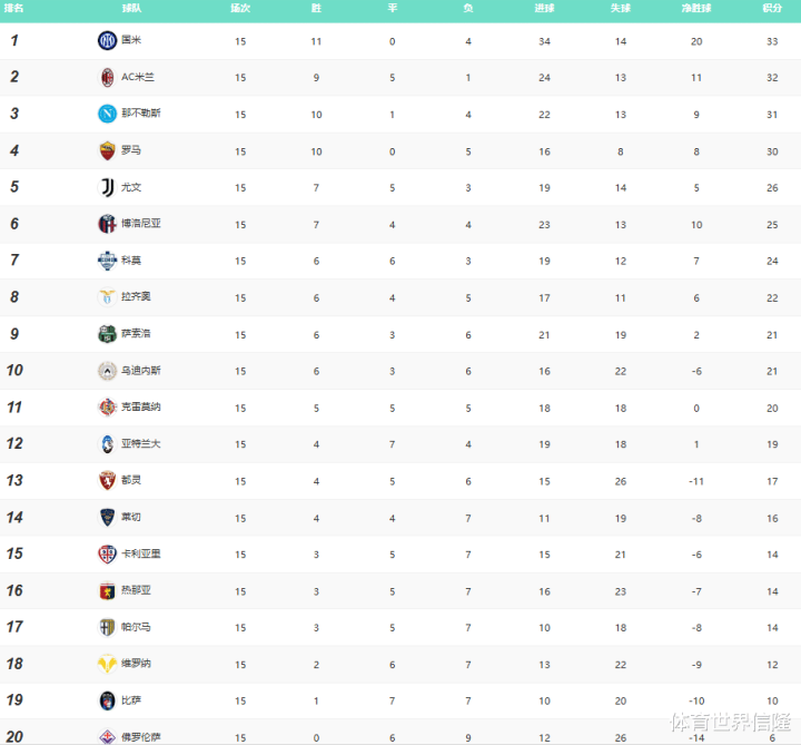 尤文图斯1-0击败博洛尼亚后,积26分升至第五位,博洛尼亚积26分退居第六;受到参加欧冠影响的亚特兰大积19分排名第12;更糟糕的是紫百合佛罗伦萨一场未胜仅积6分排名垫底。