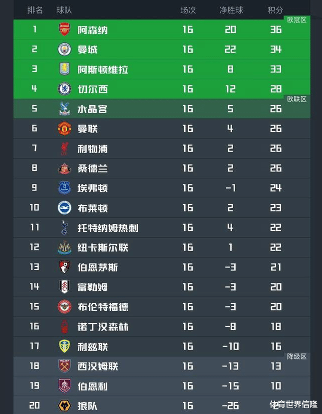 水晶宫、曼联、利物浦和桑德兰四支球队的积分都是26分,这使得他们只凭净胜球的差距分列第5至第8位。