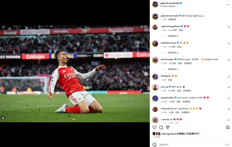 贡献绝平,马丁内利社媒晒滑跪庆祝照:我们继续奋斗 !