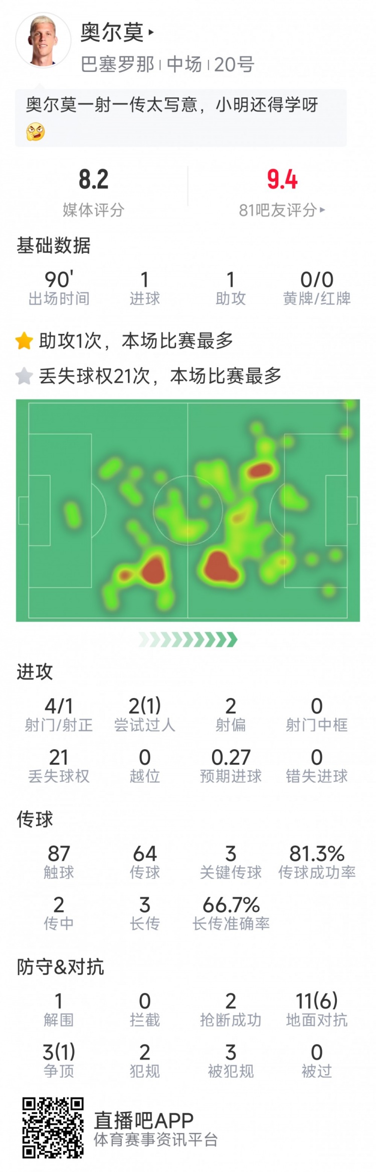 奥尔莫本场数据:1球1助功 ,4射1正,3次关键传送球 ,2次抄截