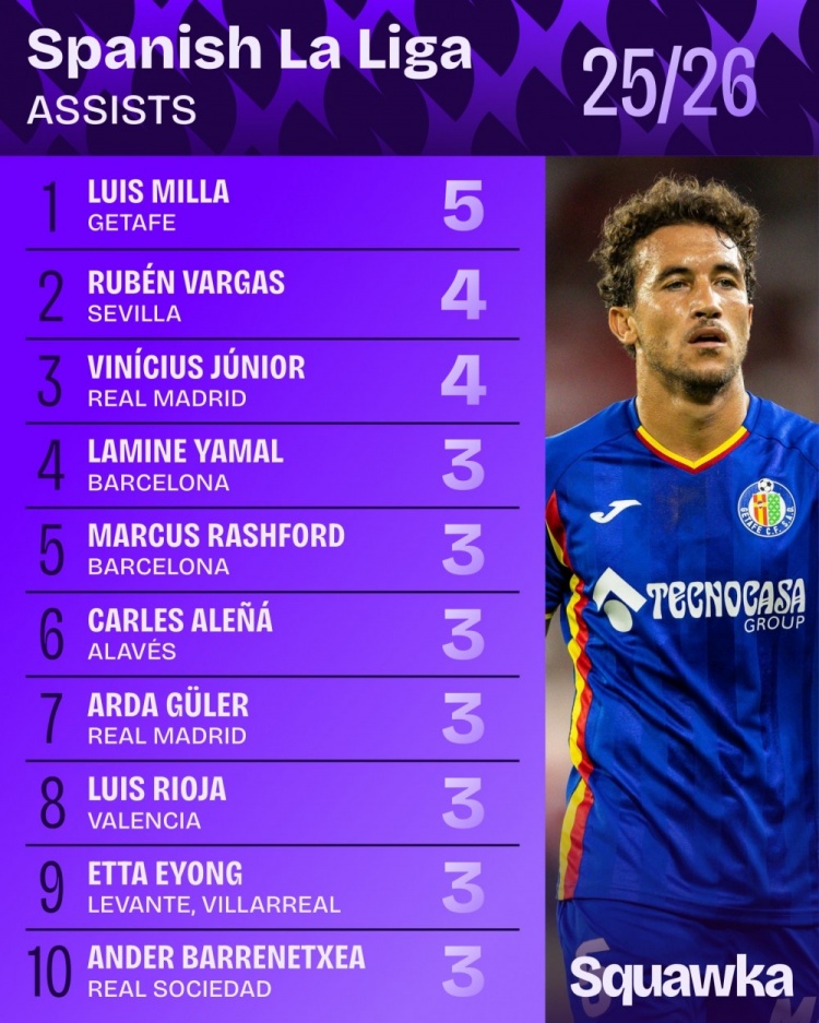10月7日讯 日前,Squawka统计了本赛季西甲助功 榜,在线看足球比赛直播免费维尼修斯并列第2,亚马尔、拉什福德、居勒尔并列第4。