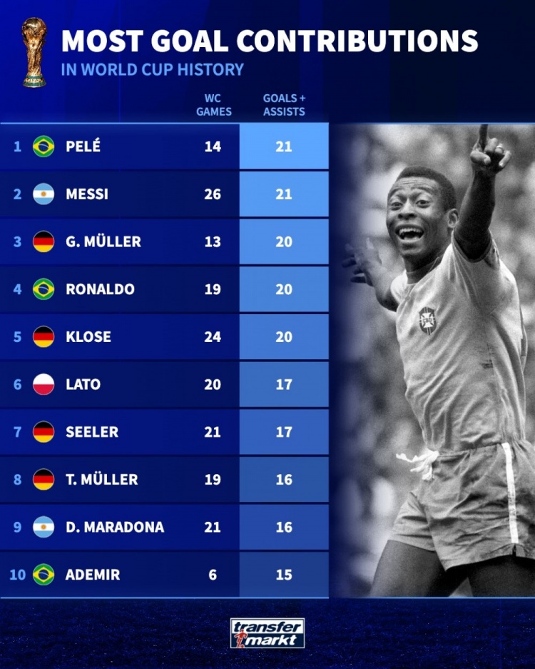 世界杯赛 历史加入 得分 榜:贝利、梅西21球并列居首,大罗20球