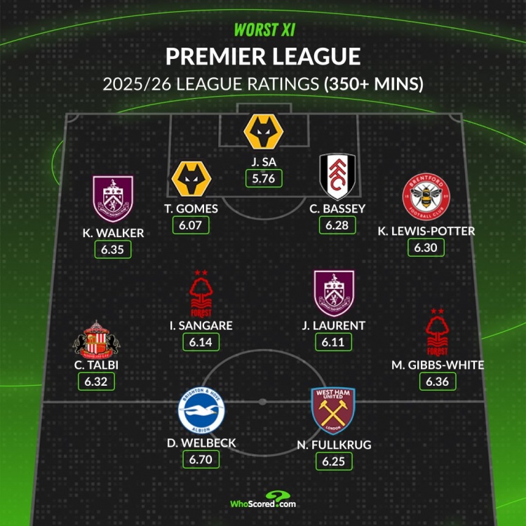 WhoScored本赛季至今英超最差阵:菲尔克鲁格、沃克在列