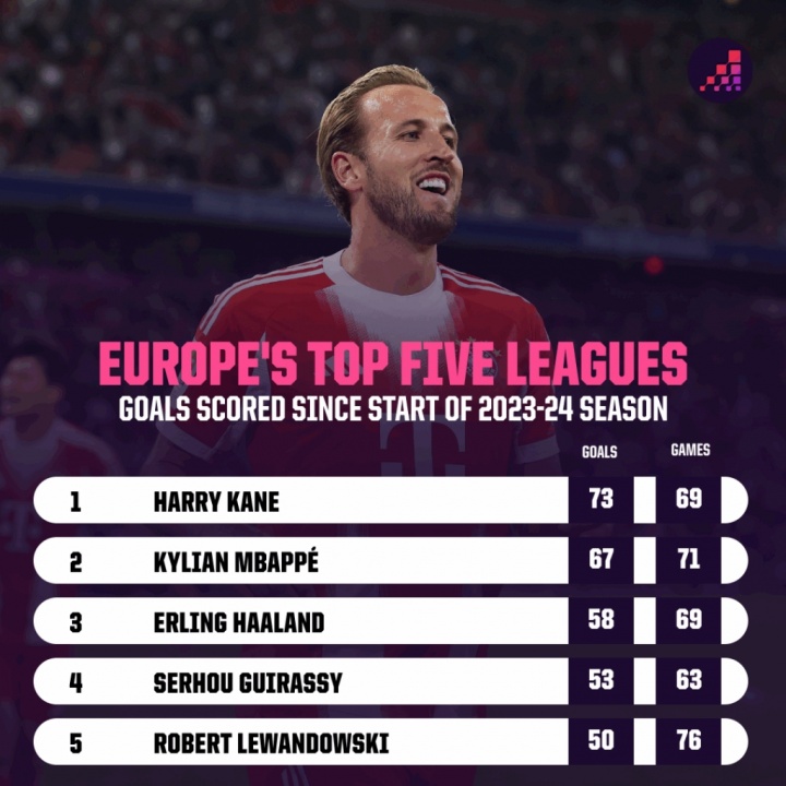 23-24赛季以来五大职业联赛 射手榜:凯恩73球居首,姆巴佩哈兰德二三