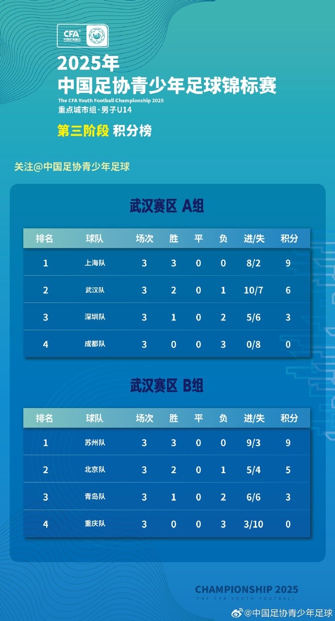 2025中青赛U14组:上海队、武汉队、苏州队、北京队晋级下一轮 四强