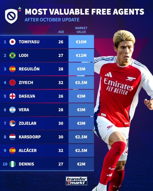自由球员身价榜:富安健洋1600万欧居首,雷吉隆、齐耶赫在列