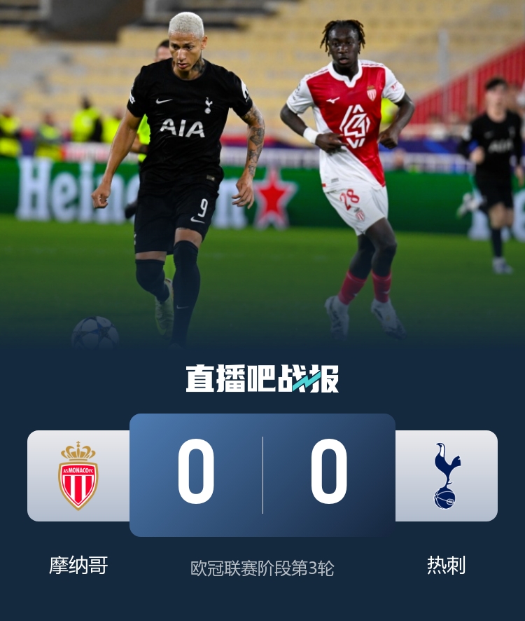 摩纳哥本轮0-0战平热刺,两队都未能取得得分 ,赛事 以闷平告终!