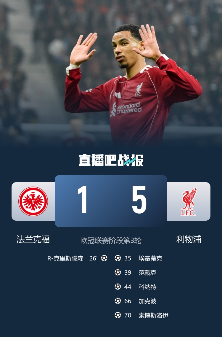利物浦在欧冠5-1大胜法兰克福,维尔茨两助功 !埃基蒂克、范戴克、科纳特、加克波和索博都取得得分 。