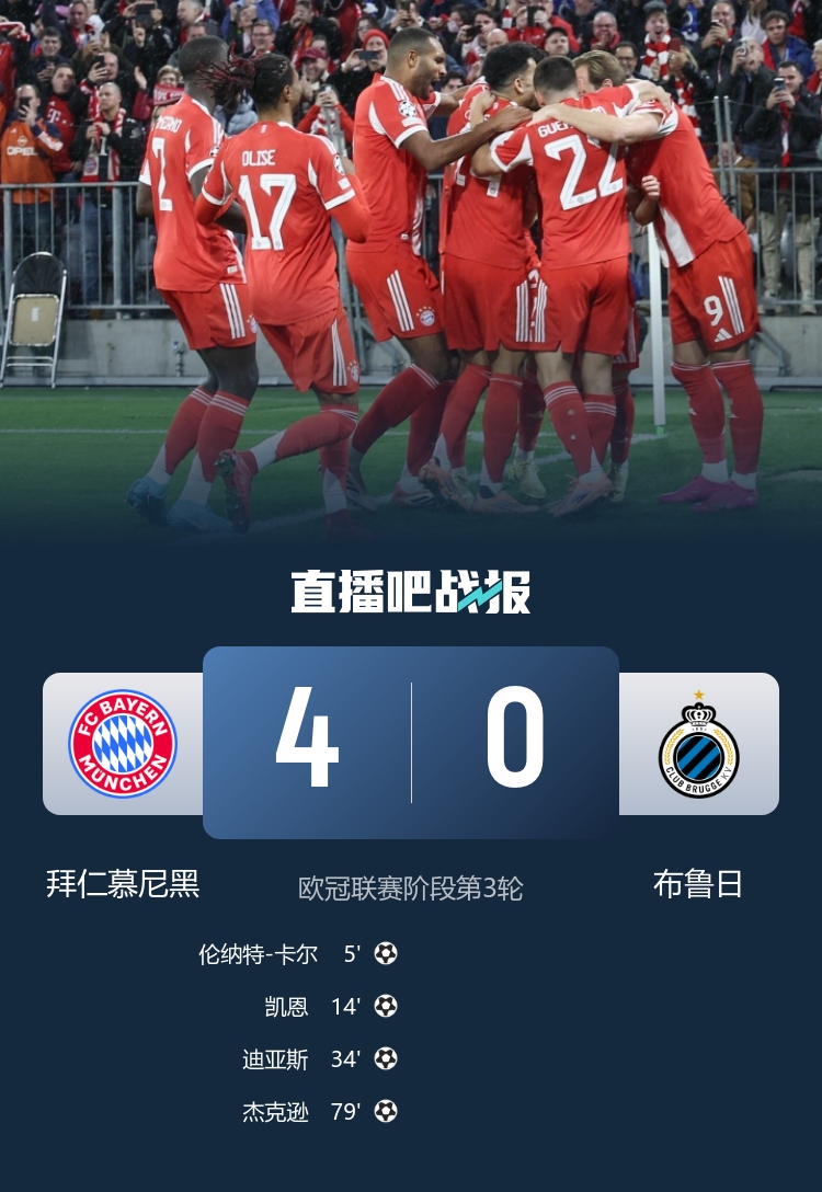 拜仁4-0横扫布鲁日,拜仁方面各赛事12连胜!本场凯恩破门,卡尔世界波,莱默尔造三球,杰克逊、迪亚斯建功。