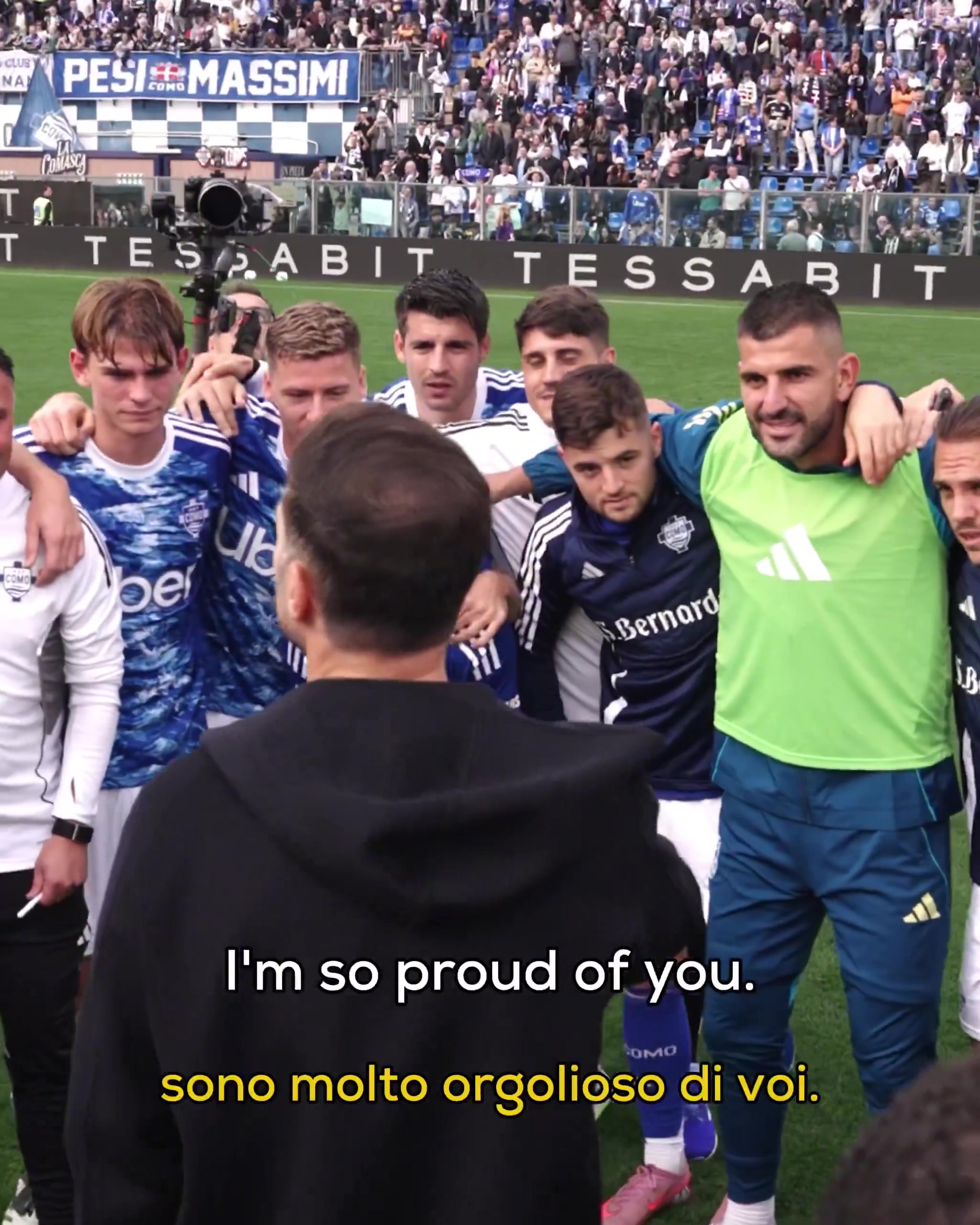 赛后科莫官方发布主帅法布雷加斯喊话的视频,法布雷加斯喊道:只有一个词,只有一个词,我为你们感到非常自豪!